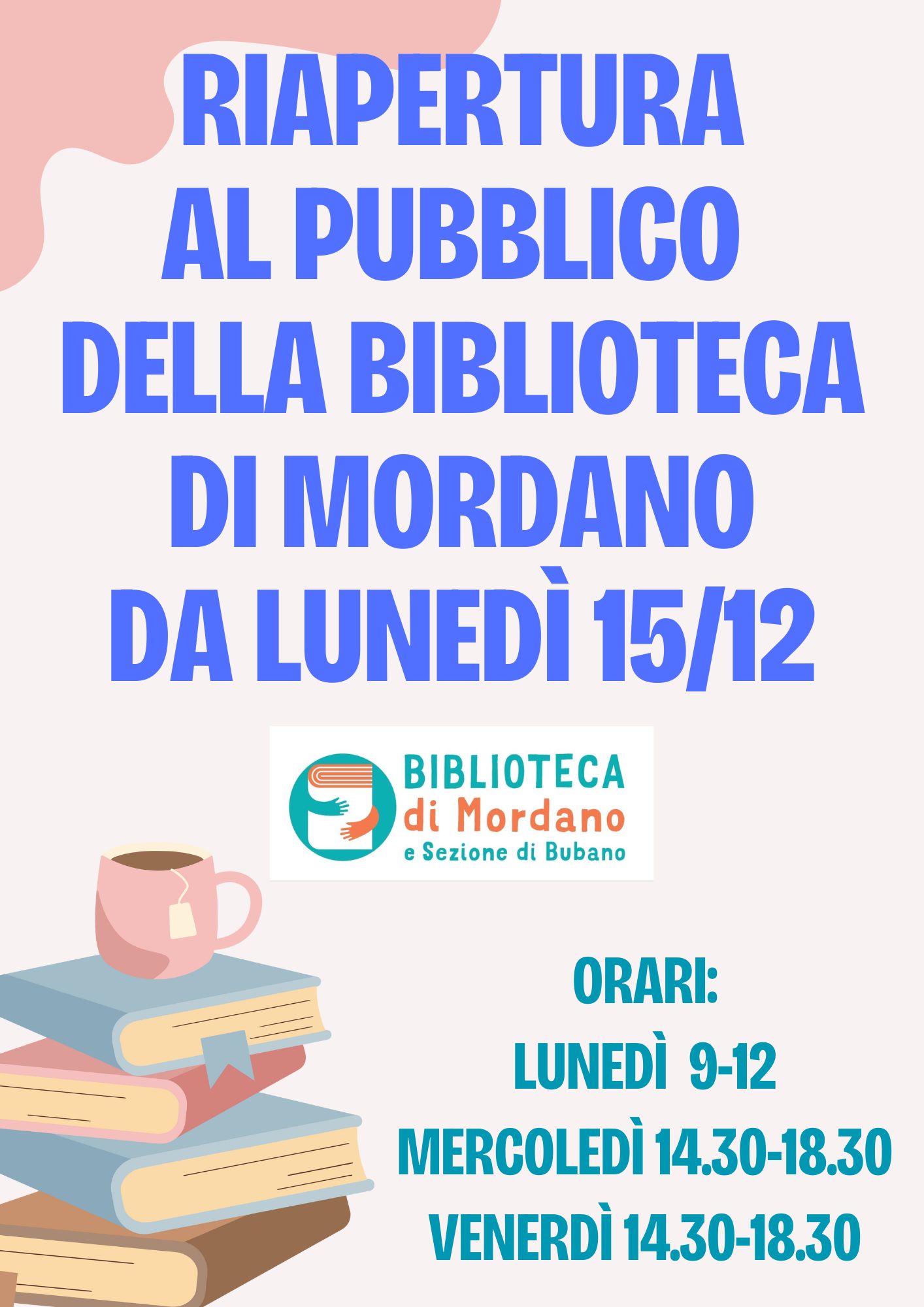 Lunedì 15 dicembre riaprirà la sede di Mordano della Biblioteca Comunale, con i seguenti orari di apertura: