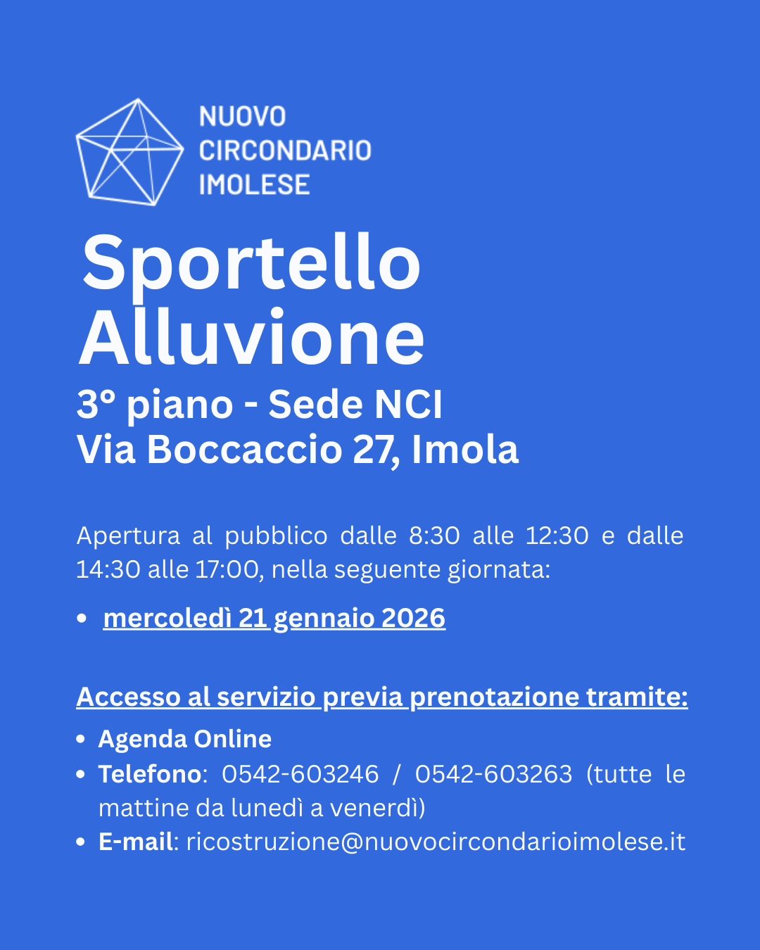 In collaborazione con la Struttura Commissariale, il Nuovo Circondario Imolese ha prolungato anche per il mese di gennaio 2026 l’apertura dello sportello pubblico dedicato alla ricostruzione post-alluvione.