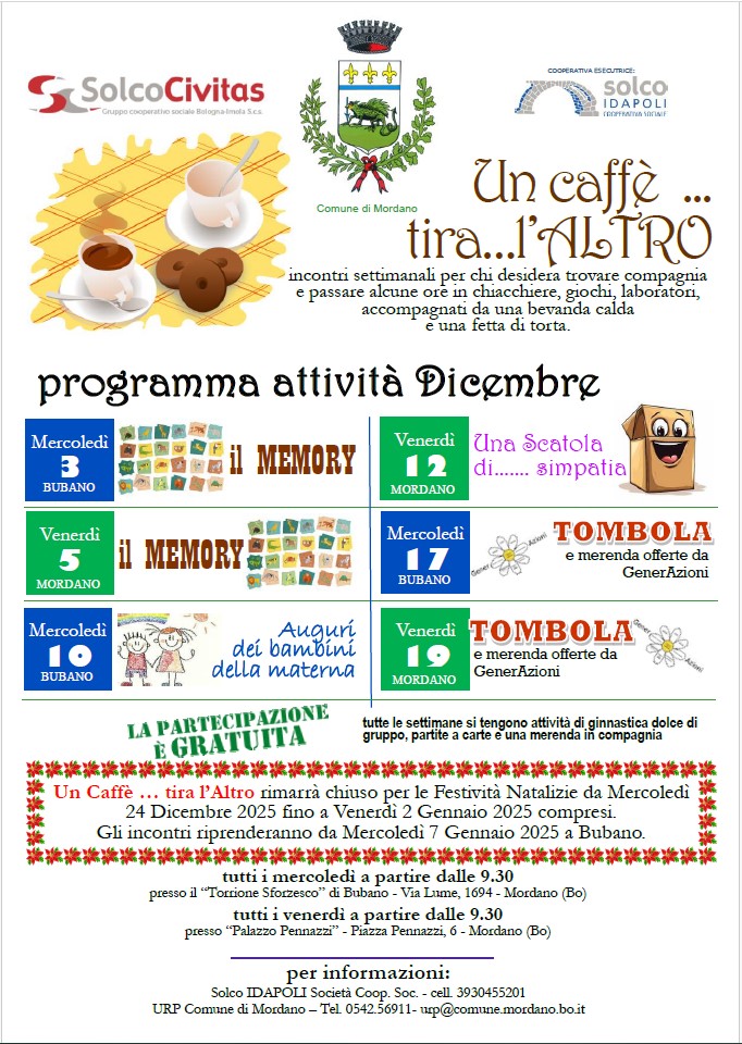 Incontri settimanali per chi desidera trovare compagnia e passare alcune ore in chiacchiere, giochi , laboratori, accompagnati da una bevanda calda e una fetta di torta.
